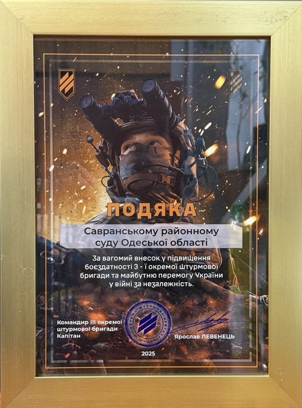 Колектив Савранського районного суду Одеської області отримав ПОДЯКУ від командира 111 окремої штурмової бригади, капітана Ярослава Левенця «За вагомий внесок у підвищенні боєздатності 3-ї окремої штурмової бригади та майбутню перемогу України у війні за незалежність». Ця подяка для нас є символом нашої єдності з тими, хто сьогодні на передовій виборює свободу України.